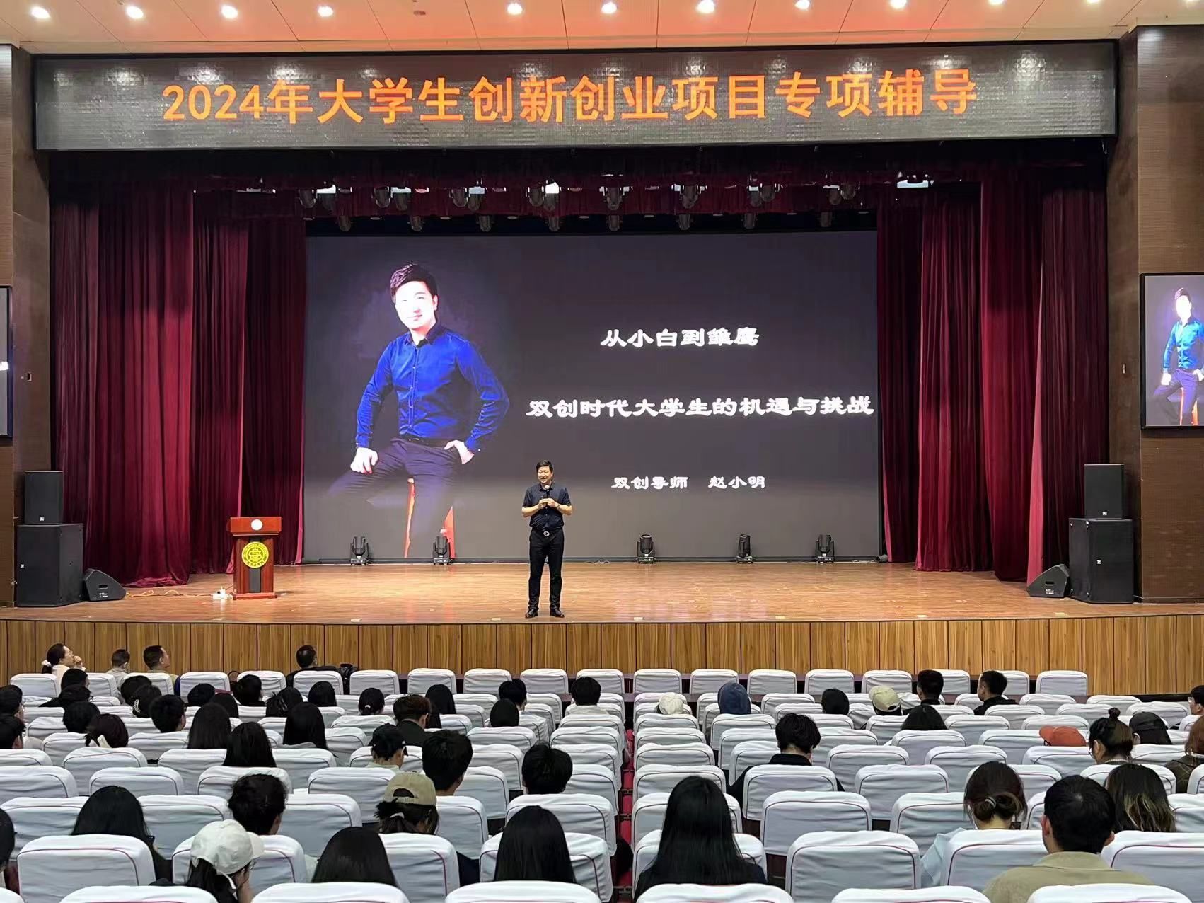 讲座现场气氛热烈,能容纳众多学生的礼堂座无虚席。台上,经验丰富的赵小明老师成为全场焦点,他带来的主题 “从小白到翘楚 —— 双创时代大学生的机遇与挑战” 直切要点,吸引着在场每一位同学的目光。